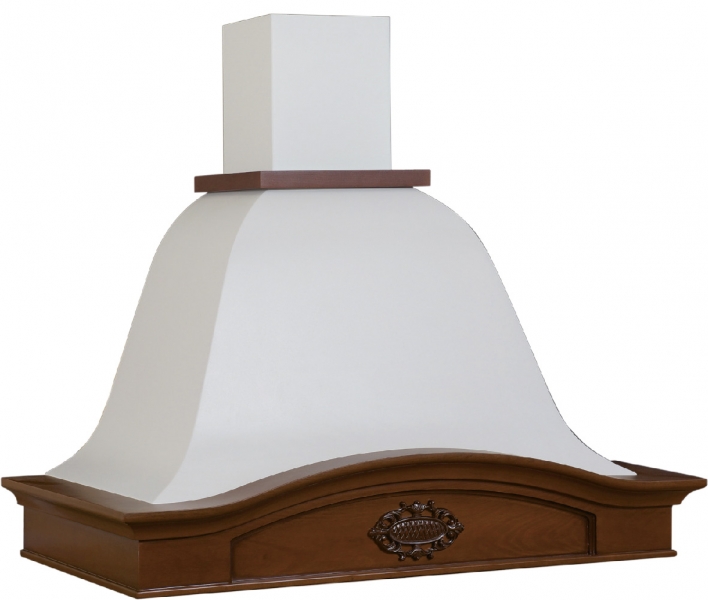 На фото представлена вытяжка в цвете купола белый муар, деревянное обрамление из Бука цвет орех.