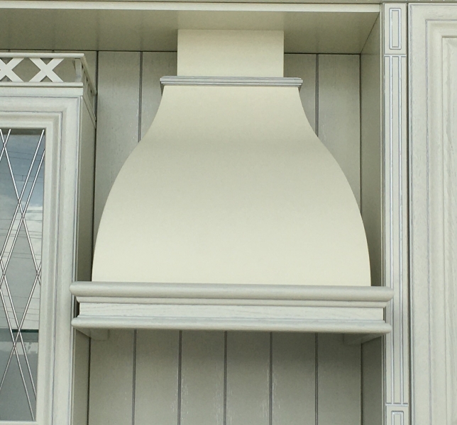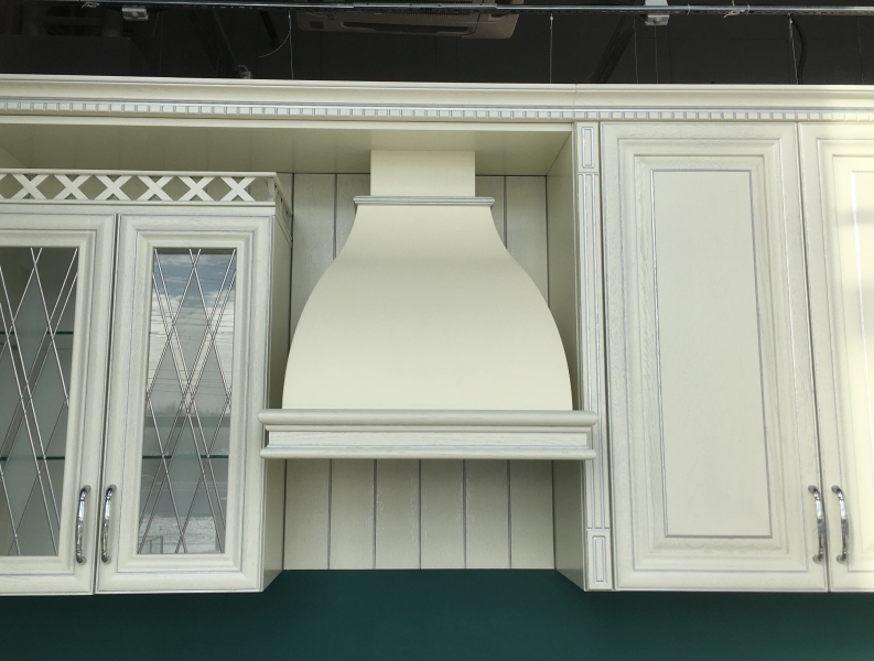 На фото представлена вытяжка в цвете купола слоновая кость, деревянное обрамление из Бука цвет слоновая кость.